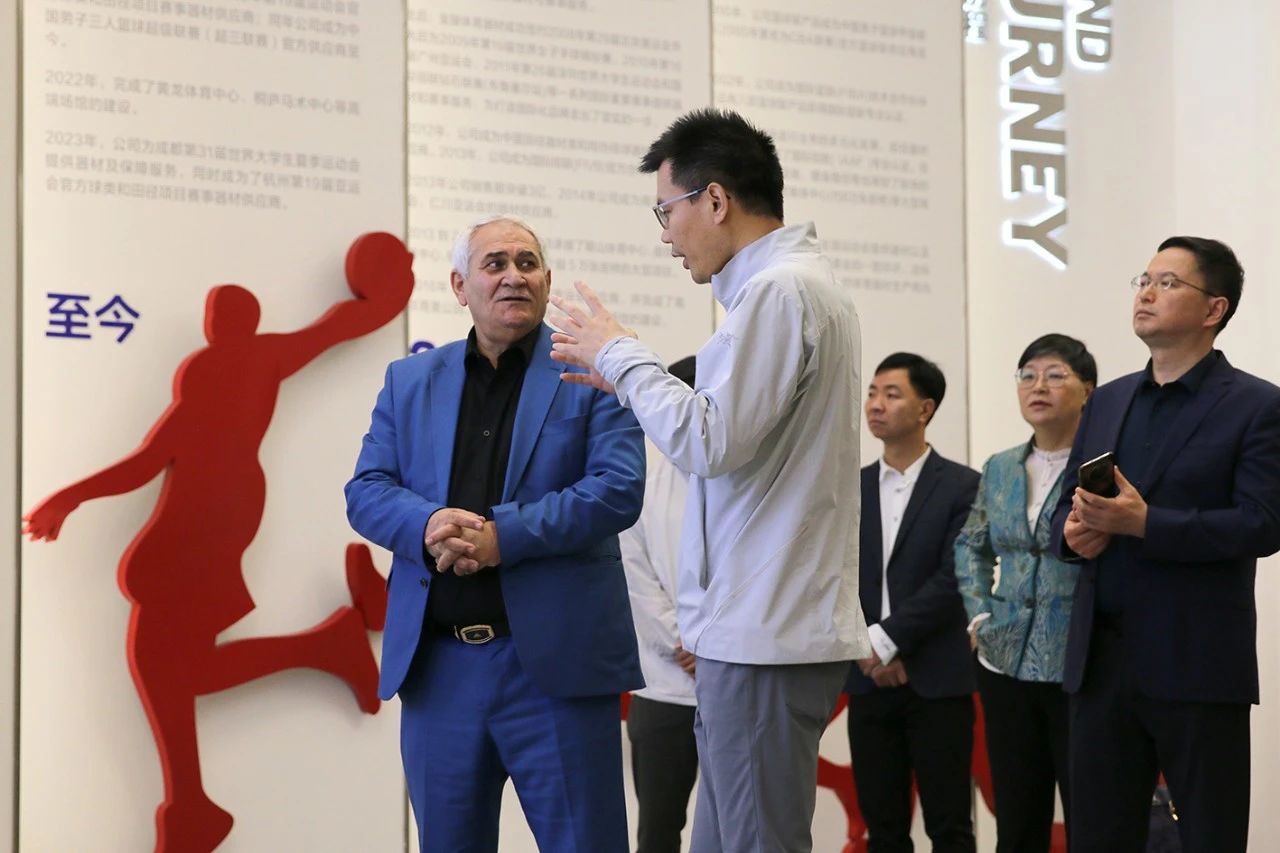 穆哈邁德·扎路主席一行在國家體育總局舉摔柔中心主任劉成亮、蘇州市體育局副局長程軍紅、張家港市文體廣旅局局長周穎和金陵體育總經(jīng)理李劍剛的陪同下,參觀了公司數(shù)字化展廳、產(chǎn)品展示館、智能化制造車間、檢測中心和金陵洲際文體,詳細了解了金陵體育的發(fā)展歷程、業(yè)務(wù)版圖以及智能化球館、籃球租售終端等數(shù)字化、網(wǎng)絡(luò)化、智能化技術(shù)下的創(chuàng)新模式和落地成果。